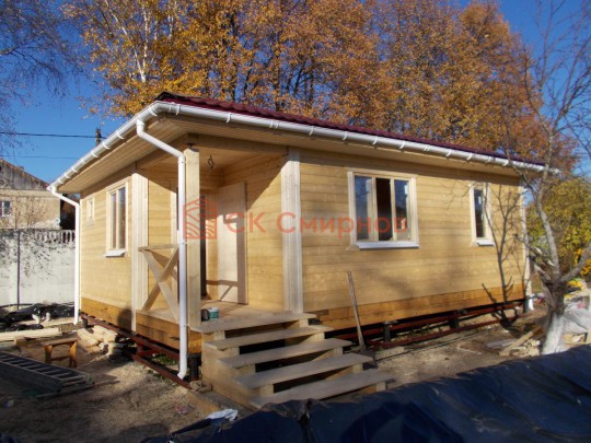 Такая одноэтажная баня 6х8 может быть построена из бруса. Ориентировочный срок строительства 10 дней.