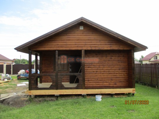 Для строительства использовался нетипичный материал: сухой профилированный брус 140х140 из кедра с имитацией под блокхауз. Таким было желание клиента. Отличный выбор. Кедр обладает очень выразительным запахом, который со временем не исчезает. Лучшая древесина для строительства бани — даём слово.