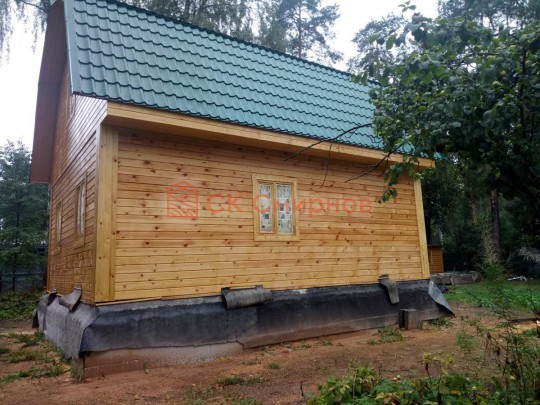 Из профилированного сухого бруса 9х14см, 14х14 см или 14х19 см. Сборка сруба в теплый угол на нагеля или гвозди 200 мм со сверлением отверстия в верхнем брусе (в зависимости от вида бруса).