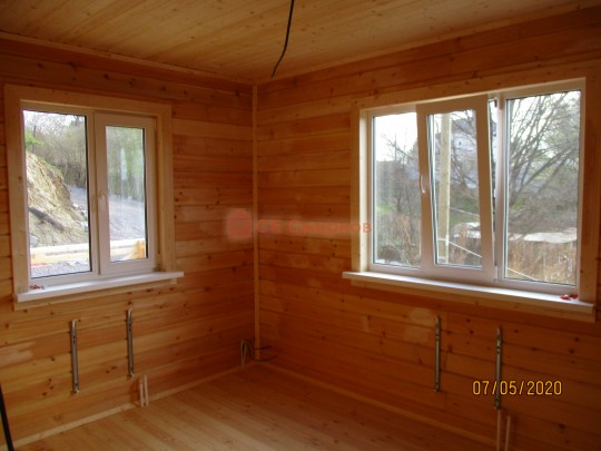 Окна мы устанавливаем настоящие деревянные стеклопакеты с фурнитурой как на пластиковых окнах, дерево используется клееное, повторюсь, не имитация деревянных стеклопакетов, а именно качественные окна.