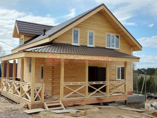 На фото представлен проект двухэтажного дома 10х11 метров для постоянного проживания и отличной планировкой общей площадью 176 квадратных метров. Можно выделить несколько особенностей проекта: терраса, веранда, туалет, ванная, санузел. Коттедж построен из клееного бруса кедра — это лучший материал для строительства современного деревянного коттеджа под ключ.