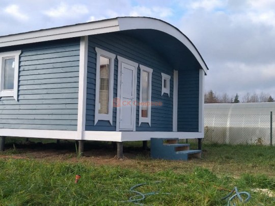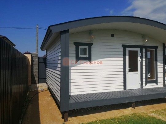 В нашем каталоге каркасных бань есть несколько очень красивых проектовавторских бань. В июне 2020 мы завершили строительство одной из них. Это одноэтажная баня каркасной сборки с округлой крышей, террасой, высокими панорамными окнами и роскошной парной, обшитой ароматнейшим кедром. Размер 5 на 5 метров. Внутри разместились комната отдыха, парная, помывочная с душевой системой и санузел, который по совместительству является бойлерной.