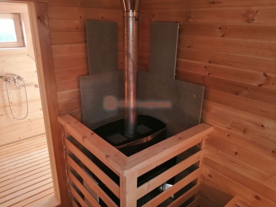 Установка печи Теплодар Русь сетка 12 л панорама ( со стеклянной дверцей ), трубы сэндвич, проходы и зонт входят в стоимость бани. Экран металлический через стену. На полу кладется кирпич, базальтовый картон, минерит. На стенах базальтовый картон, минерит, через втулки прикручивается минерит. Ссылка на сайт производителя https://www.teplodar.ru/catalog/detail/rus_setka_12_l_panorama/